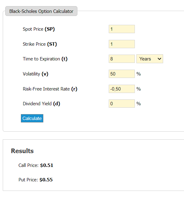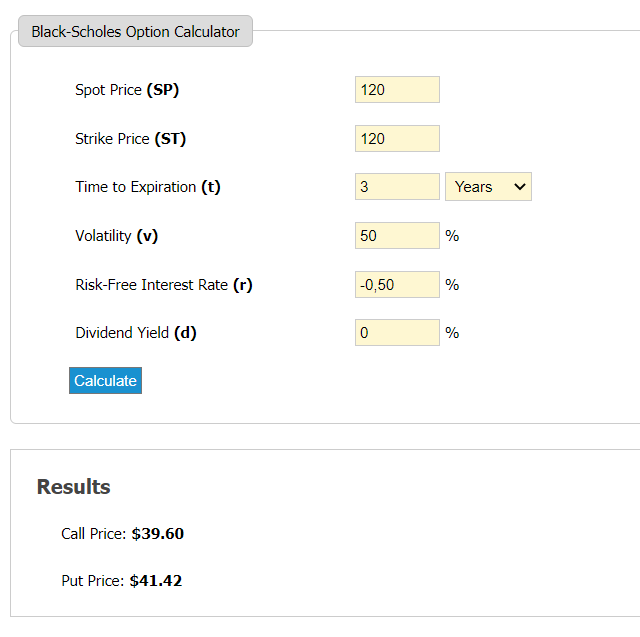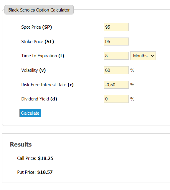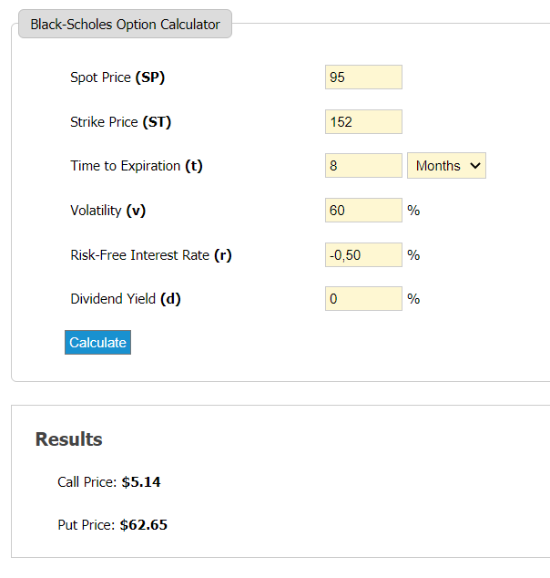 El valor de las opciones depende mucho de la volatilidad que le asignemos. Podemos discutir si la volatilidad adecuada es el 60% o el 40%, pero en todo caso lo importante es darse cuenta de que la opción tiene un valor y que este no es pequeño. Para jugar con los números: https://goodcalculators.com/black-scholes-calculator/