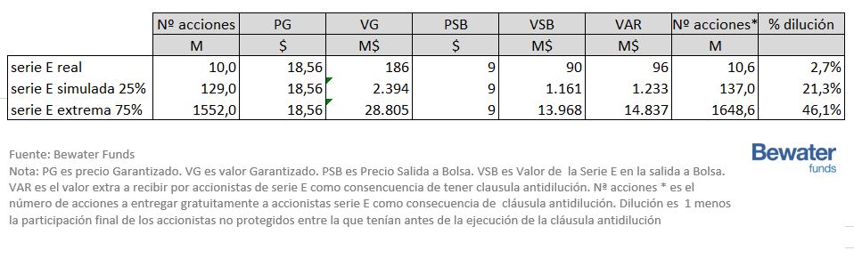 Tabla 2. Simulación en que las acciones de Serie E constituyen una dilución del 25% antes de la salida a bolsa