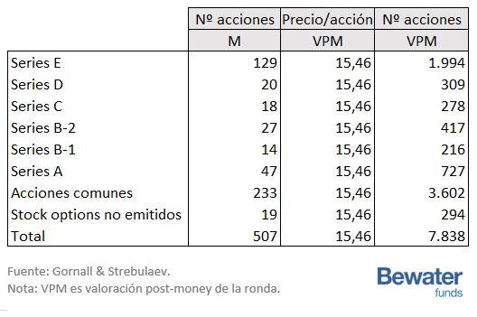 La salida a bolsa se produjo 1 año más tarde y fue a 9 dólares. Por lo tanto, a los poseedores de acciones E en virtud de su cláusula antidilución se les emitió gratuitamente algo más de 90 M$ en acciones. Se les emitió sin coste la diferencia entre 18,56 y 9$ en nuevas acciones, esto es 10,6 millones de acciones (ver tabla 3). Esto supuso una dilución del 2,7% – antes de la salida a bolsa los accionistas, excluyendo a los de la serie E tenían el 97,4, % y después de la ejecución de la cláusula retuvieron el 94,8%, 1-(94,8%/97,4%) -. Bueno, un 2,7% no es terrible, pensaréis.
