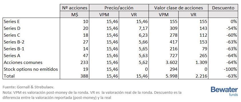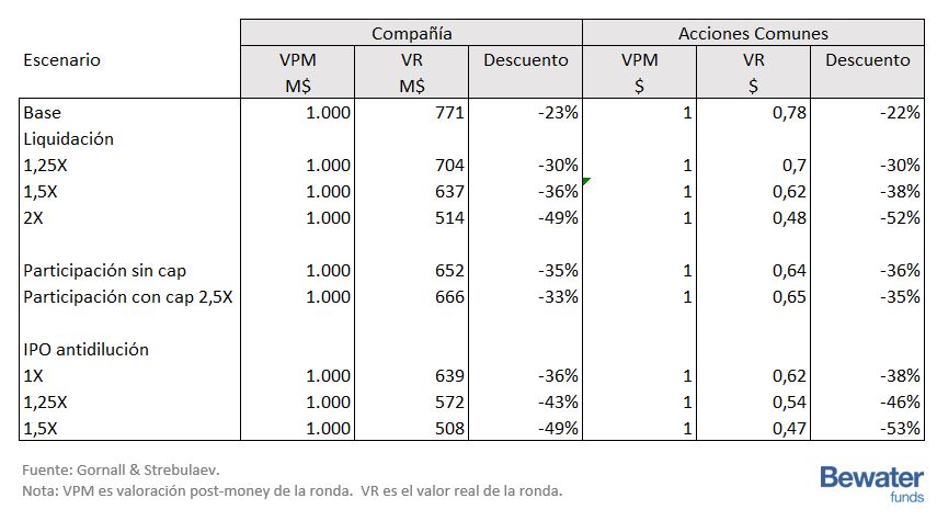 - Las acciones con cláusulas de liquidación preferente y antidilución valen más que las que no lo tienen.
