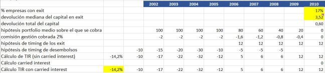 Las comisiones de gestión siempre se cobran sobre el precio de inversión (sin tener en cuenta la posible apreciación de las participaciones de las empresas invertidas). Y en las dos columnas finales se ve lo que se va a pagar por comisiones de gestión según nos cobren sobre lo invertido (2,2 M€) o sobre lo comprometido (3,7 M€), un 65% más. A notar que a partir del momento en que se empieza a desinvertir las comisiones se igualan, porque lo habitual es que en la fase de desinversión se pase a cobrar por lo efectivamente invertido.